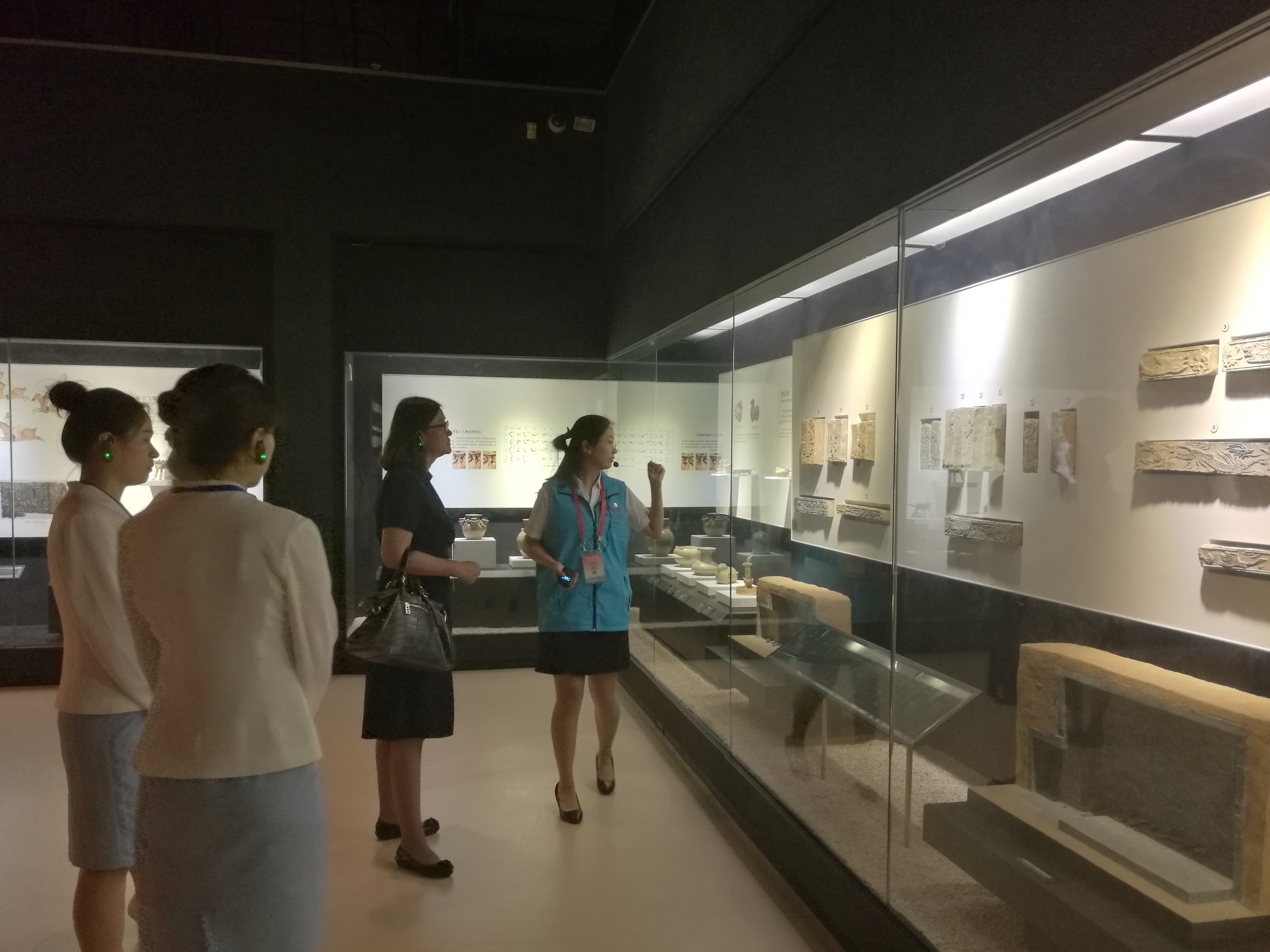 而在随后的参观过程中,来自emc易倍体育app的志愿者们显示出专业的业务能力,虽然是在校研究生,但已有独立承担讲解任务的能力。她们主要负责讲解、现场接待、引导与答疑,为来宾们介绍了海上丝绸之路和福建古代文明之光展厅。在介绍宋代科技部分时,队员张文详细介绍了在世界科技史上有着重要地位的水运仪象台;在介绍主持建造水运仪象仪的福建人苏颂(中国历史上著名的天文学家、物理学家、机械学家,植物学家、药理学家,还是当时著名的文人和大臣,宋哲宗时拜相)时,为方便外宾理解,张文将他比作中国的达芬奇。志愿者们还为来宾介绍了从国外输入、见证福建繁荣海外贸易的孔雀蓝釉瓶等文物。