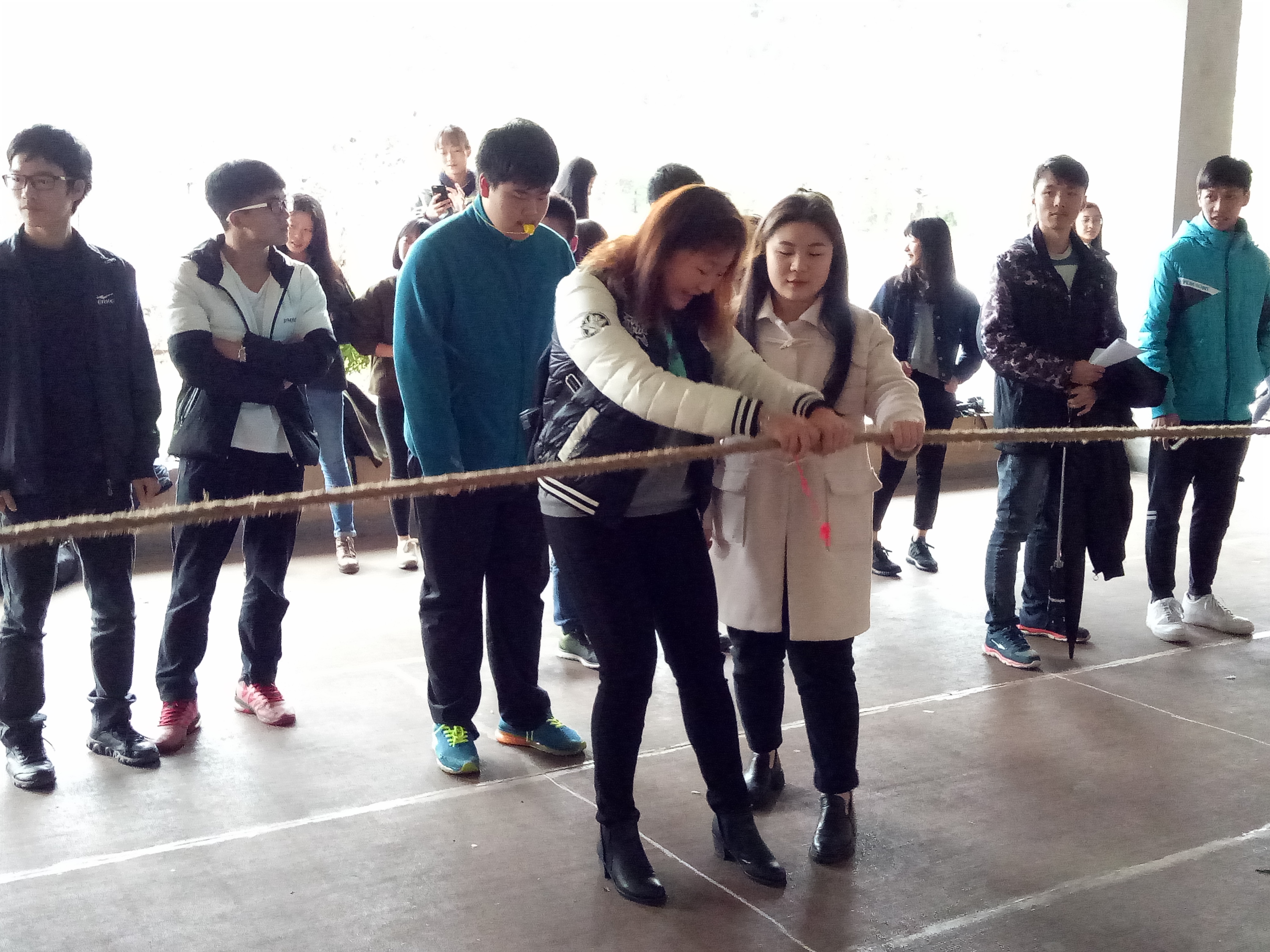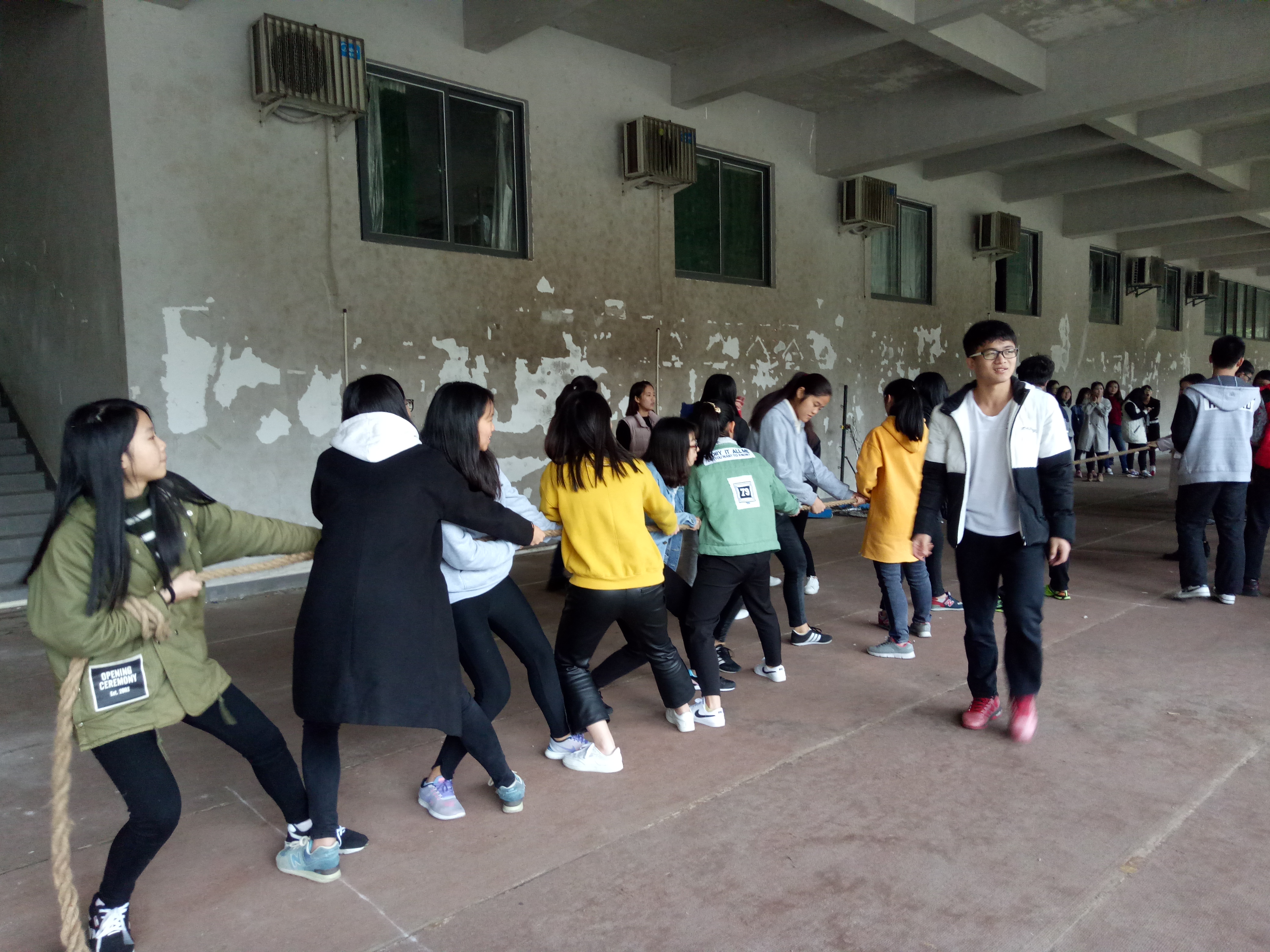 比赛当天,由于近日的阴雨天气,比赛场地由三区田径场临时换成了体育馆外围的跑道。尽管天公不作美,但这丝毫没有影响同学们参加比赛的热情。参赛队伍以班级为组别,11人为一支队伍,其中女生10人,男生1人。当裁判的哨声响起,只见参赛的队员们紧握长绳,卯足了劲儿往后拉,并呈现出“一边倒”的架势。旁边观赛的群众也自发地为参赛队伍加油鼓劲,呐喊声、哨子声此起彼伏。无论是场上还是场下,气氛都异常紧张。虽然参赛的队员绝大部分是女生,但是她们的拼劲丝毫不输给男生。每一位参赛队员都竭尽全力,想为自己的班级争得荣誉。最后,来自15级英语一班的队伍取得了此次比赛的冠军。比赛结束的刹那,队员们和观众们都发出了响彻云霄的叫好声!
