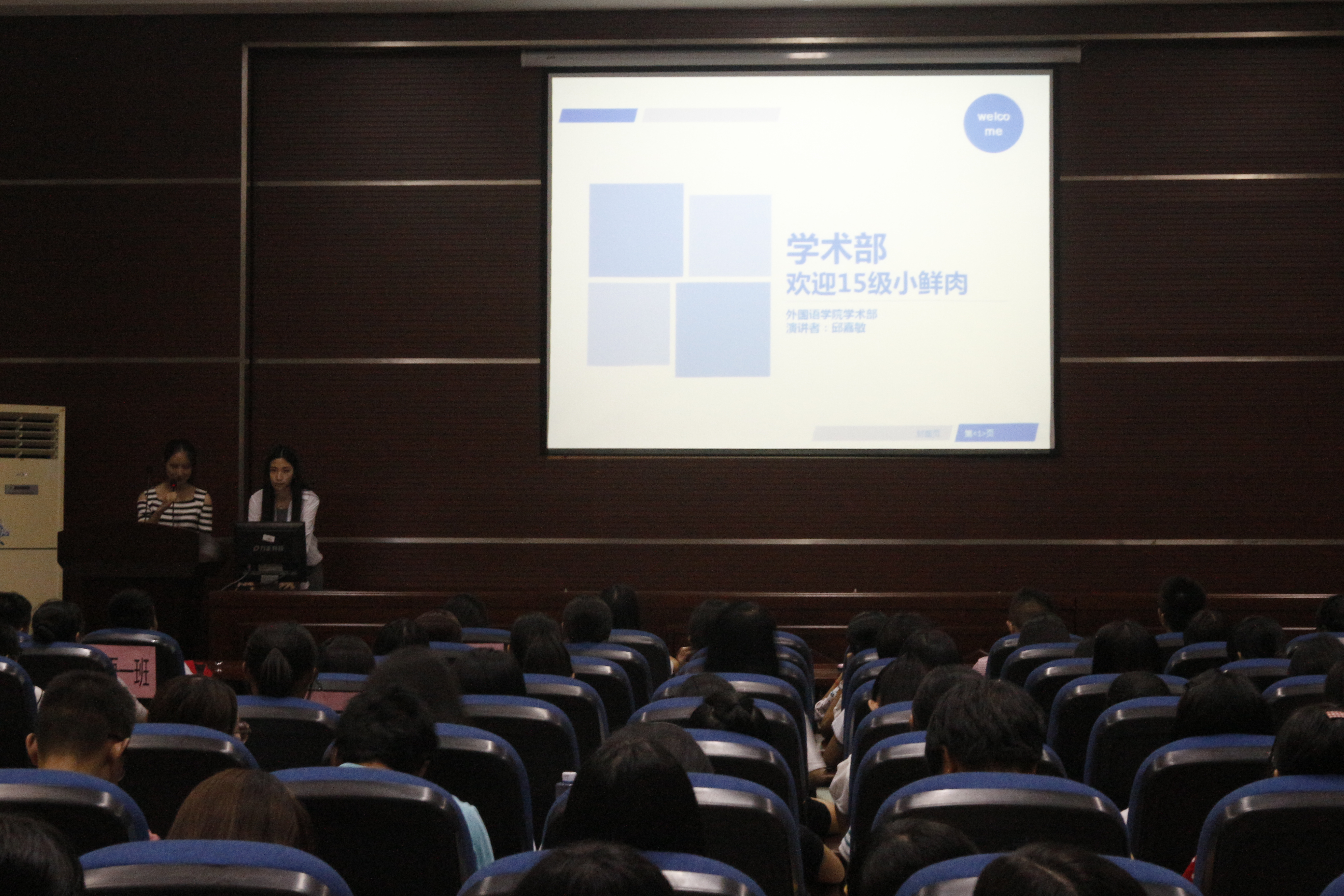 9月11日晚7时,由emc易倍体育app团委学生会主办的纳新宣讲会在院办会议室顺利举行。出席本次宣讲会的有学生会主席团各成员,各部门部长协会会长,外院2015级英、日、德三专业新生。
