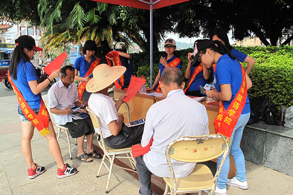 上午9点,我院实践队随队伍赴上杭县城广场开展义务维修电器、健康义诊、交通安全、法律、环境保护及高校资助政策宣传等活动。我队主要负责“安全人人抓,幸福千万家”交通安全知识普及活动,在上杭县公安局交警大队人员协助下普及活动有序地进行着,源源不断的人群来到帐篷里,队员积极热心地与当地群众交流,宣传夏季交通安全、酒驾安全等知识。虽然此次宣传活动一直要进行到下午1点,但是实践队员们的热情依旧未减。