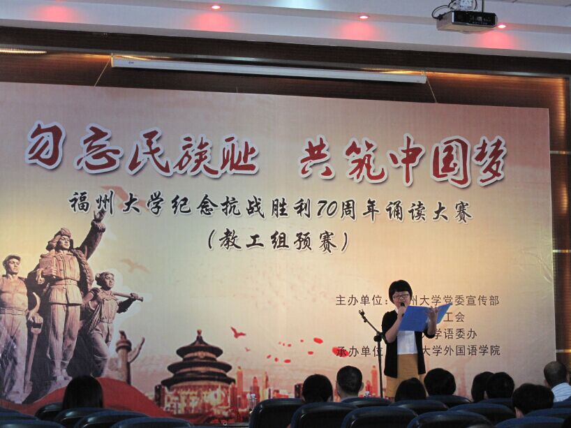 为纪念抗战胜利70周年,6月4日下午2时,由emc易倍体育app党委宣传部、emc易倍体育app工会、emc易倍体育app语委办主办,emc易倍体育app承办的以“勿忘民族耻,共筑中国梦”为主题的纪念抗战胜利70周年朗诵大赛之教工组预赛在emc易倍体育app学院办公楼三楼大会议室举行,共有20位老师参与到此次比赛当中。