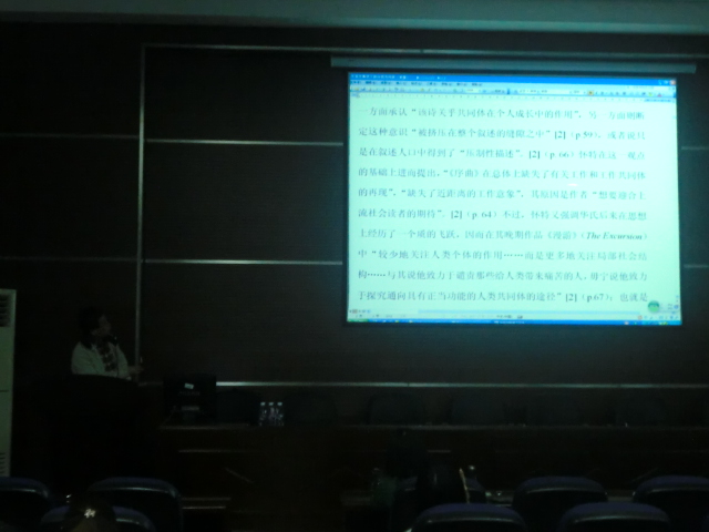 殷教授一进场就以幽默的口吻赢得了同学们的阵阵掌声。接着,他从两个部分向在座的听众全面而生动地介绍了华兹华斯笔下的共同体情怀。首先他详细解释了什么叫做共同体。他指出,共同体是生机勃勃的有机体,是我们的社会结构,社会基础。在华兹华斯笔下体现在一种深度沟通的共同体情怀。第二部分,他提出了华氏笔下的“对陌生人的深度关怀”,并说明只有在深度共同体中,沟通才成为可能。殷教授形象的讲述让同学们迅速得以理解。