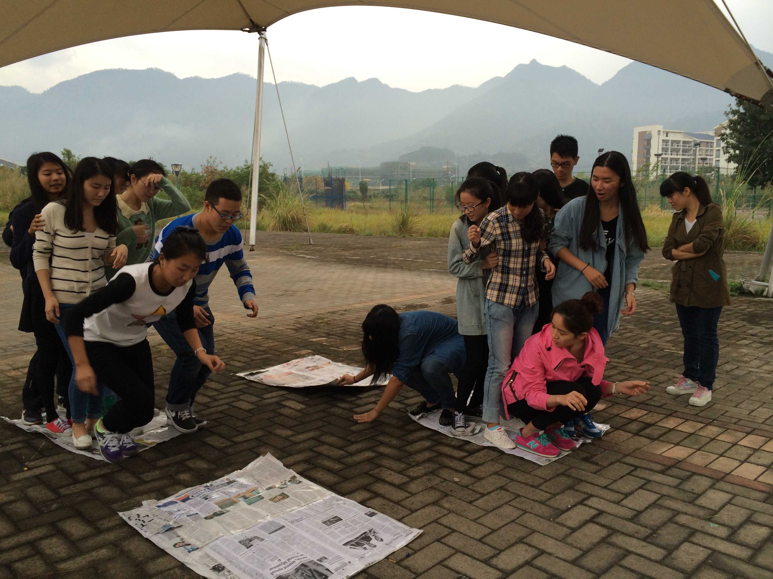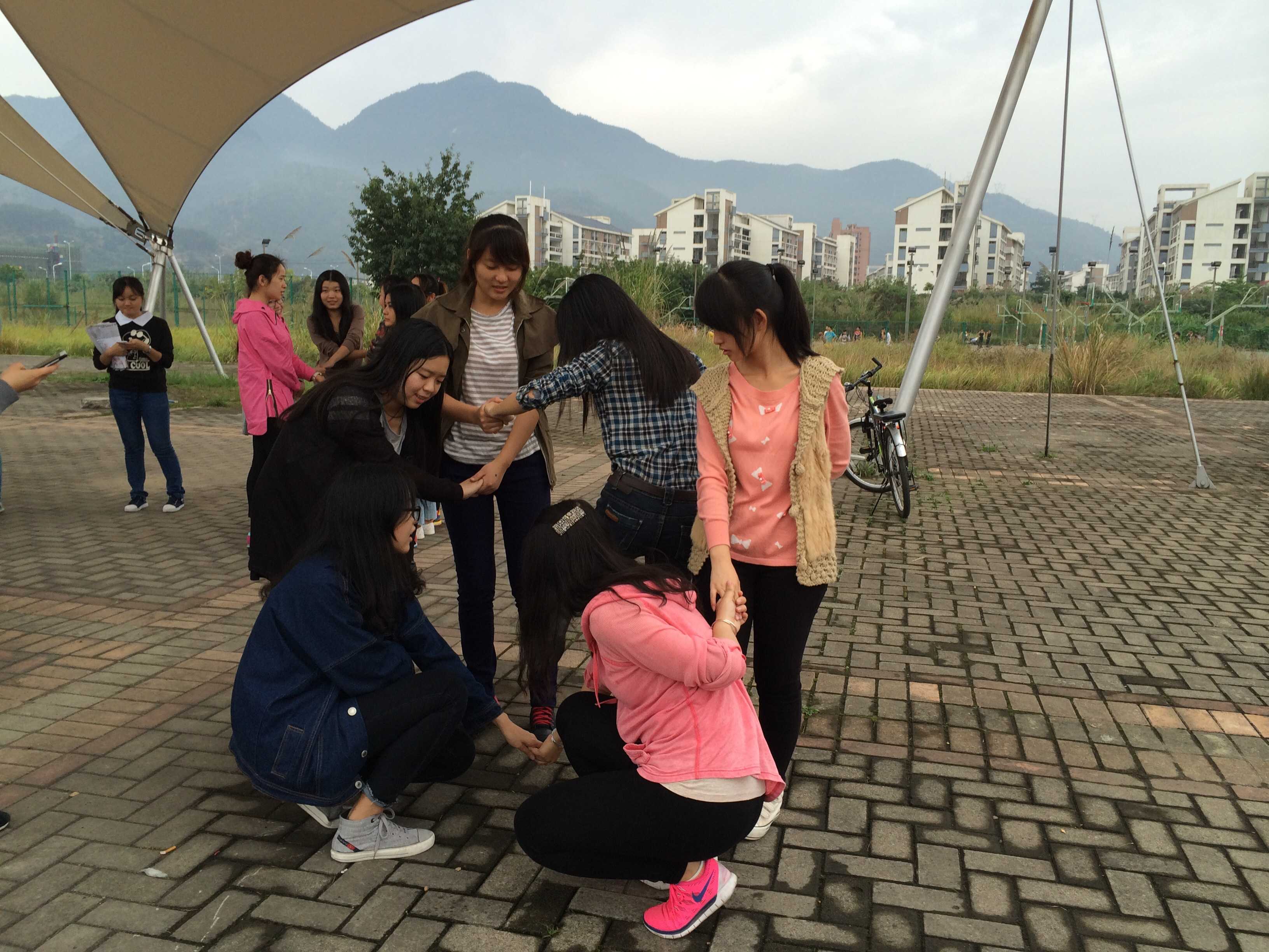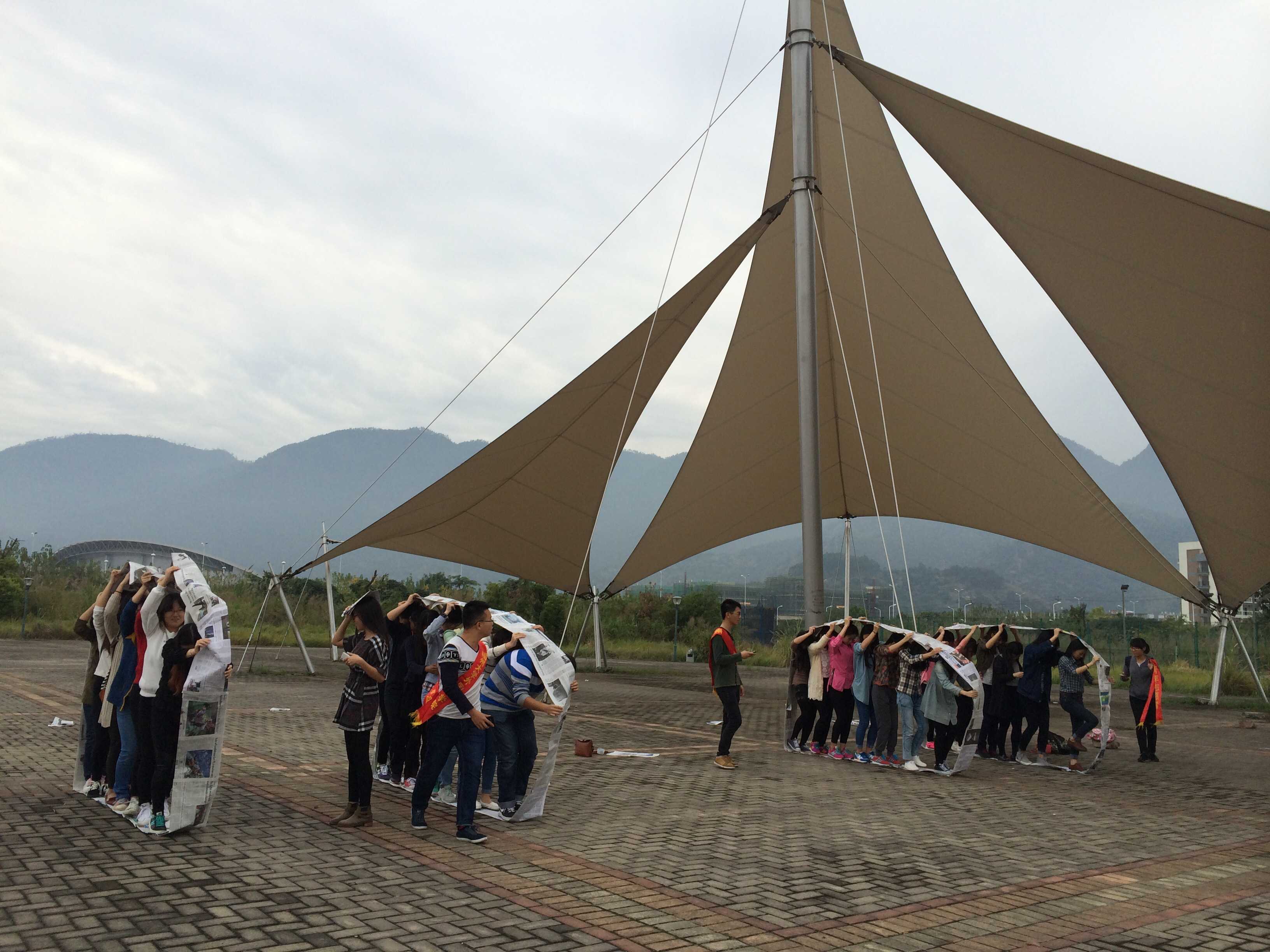 户外素质拓展活动包括四个以下游戏环节:无敌风火轮、解手链、信任互坐、搭桥过河。学生干部们分为四组进行游戏。无敌风火轮游戏过程中,各组利用报纸和胶带制作一个可以容纳全体团队成员的封闭式大圆环,将圆环立起来全队成员站到圆环上边走边滚动大圆环。新奇有趣的游戏方式很快就激发了学生干部们的游戏热情,他们积极投入其中,制作好道具,每个人都小心翼翼走好每一步。解手链、信任互坐以及搭桥过河等游戏同样新颖有趣,惩罚环节更是令人忍俊不禁。在淅沥小雨中,学生干部们的游戏热情丝毫不减,整个三区操场充满了他们的欢声笑语。