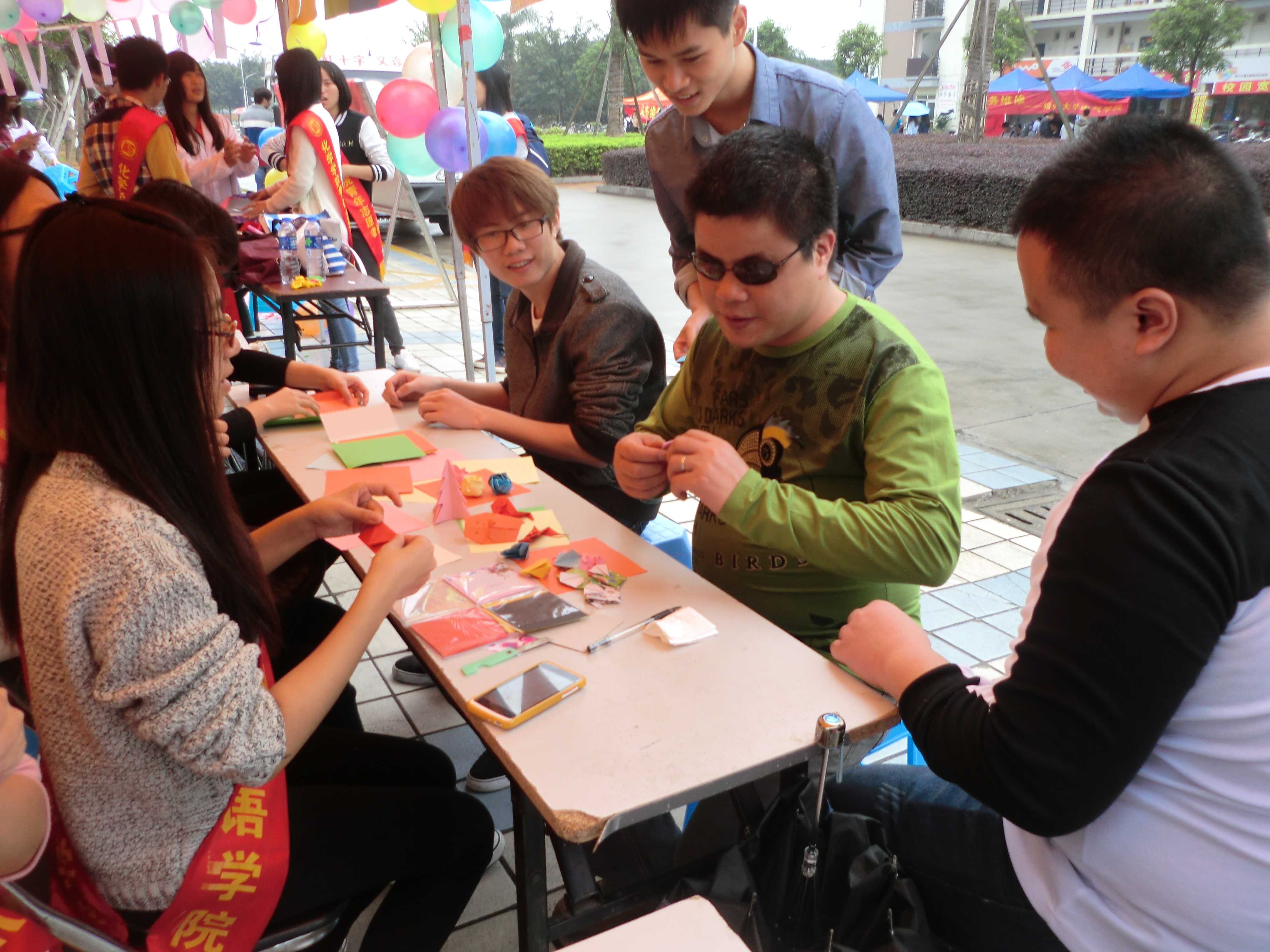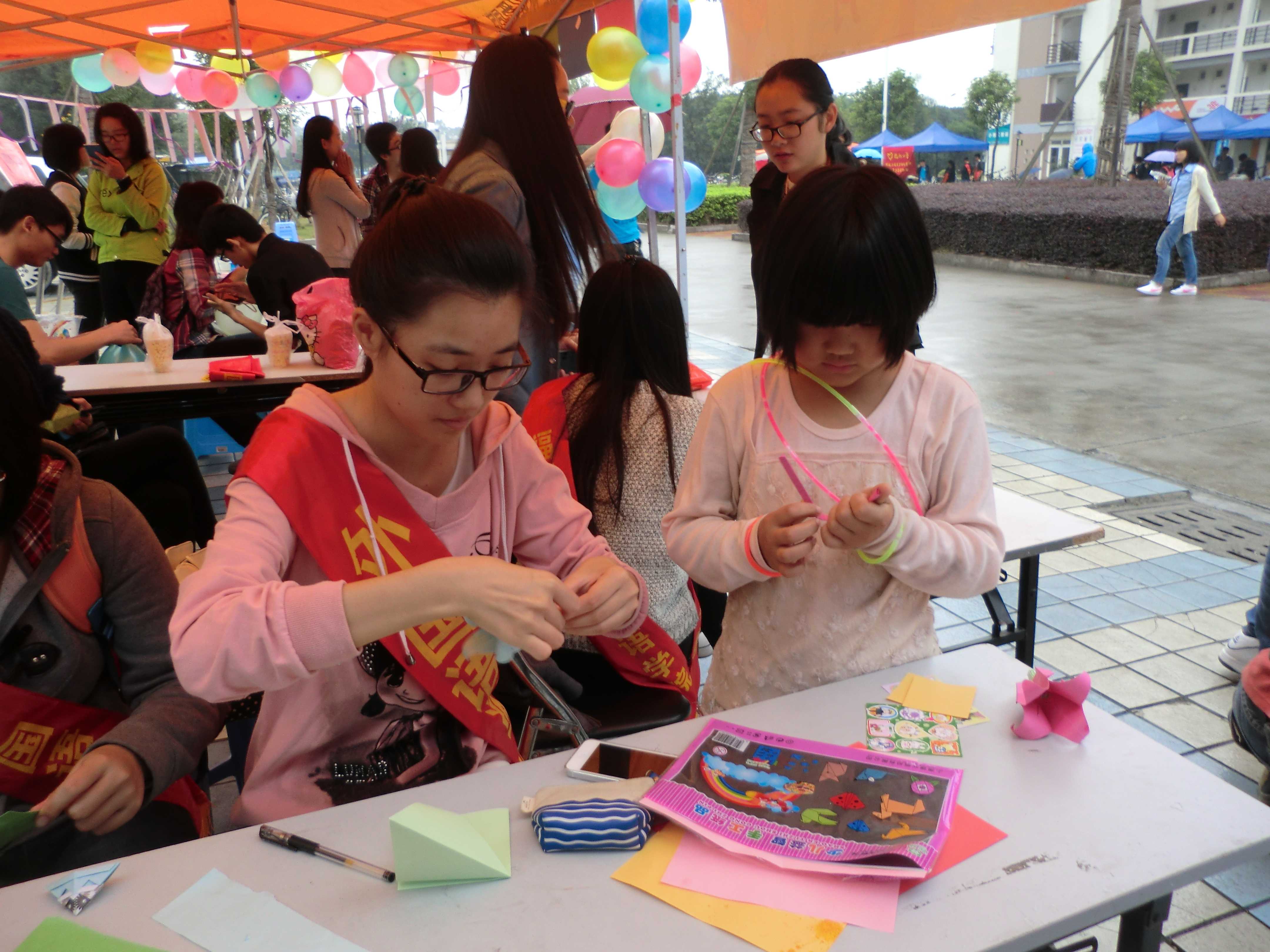 来自各个学院的青年志愿者拉开帐篷摆起桌椅,在绵绵的细雨中诠释着志愿者的内涵与价值。而其中,虽然emc易倍体育app青年志愿者协会的帐篷没有过多的装饰而显得其貌不扬,但走近就会因它用心的设计而从心底涌起暖意,尤其是展牌上十几张支教小学学生的照片,他们灿烂的笑脸便是志愿者存在意义最美的注脚。此次emc易倍体育app青年志愿者协会开展活动的主要形式是做手工,各色彩纸在青协志愿者手中华丽蜕变成栩栩如生的花朵与小动物。经采访我们得知,为了活动的顺利开展,志愿者们在学习折纸上可谓做足了功课。功夫不负有心人,当细雨渐渐停歇,越来越多的同学在emc易倍体育app的帐篷前驻足并跃跃欲试。值得一提的是,外院的活动不仅吸引了隔壁学院青年志愿者协会的部员,而且吸引了两位盲人朋友。他们坐在桌前,在外院青协志愿者的耐心指导下完成了一件件作品,虽然不是很精致,却凝聚了爱与希望。