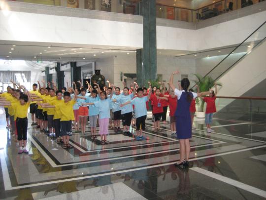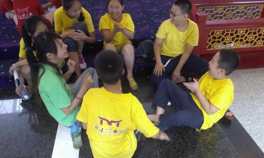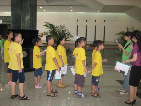 早上的排练依旧辛苦,但经过几天的磨练,现在,小朋友们都很好地坚持下来了。虽然辛苦,但脸上都还洋溢着幸福的笑容,这令在场的老师和志愿者都感到开心,工作起来也更加投入了。休息的时候,志愿者则和小朋友们坐在一起游戏,看着他们露出开心的笑容,志愿者们也十分喜悦。当博物院的老师们有事离开时,志愿者们更是尽心尽责地担起了小老师的职责,各自组织各自的队伍站好队形,带领他们练习诗朗诵。小朋友们也十分认真,一个比一个读的大声有力,念到各自队伍的口号时更是相互竞争起来,带着势必能够压过其他的队伍信心。