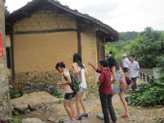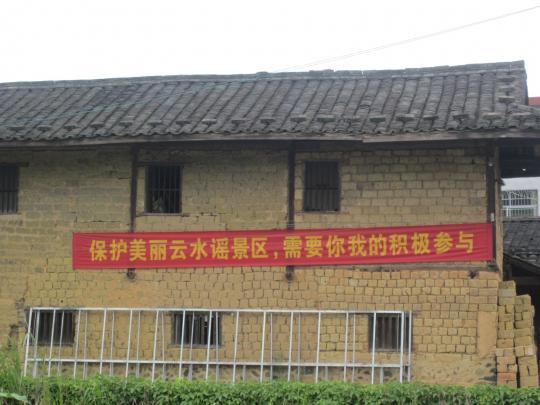 路途虽然漫长曲折,但同学们仍旧满怀期待踏上寻访漳州云水谣古镇之旅。今天同学们的主要任务是进行实地考察,从当地居民处了解当下古镇保护现状。同学们在参观游览云水谣景区秀丽风光的同时,也感受到漳州市政府对云水谣古镇保护的重视。在深入考察云水谣古镇的过程中,同学们发现不少地方悬挂着政府宣传保护云水谣理念的标语。其内容既有号召保护环境的,也有严厉告诫人们不能在景区内建造违章建筑的。保护标语警醒而深刻,足以见得政府正着手从群众意识出发,强化人们古镇及其文化的保护观念。在热心阿姨的带领和讲解下,同学们顺利地结束了包括景区和居民区在内的考察,收获颇丰。
