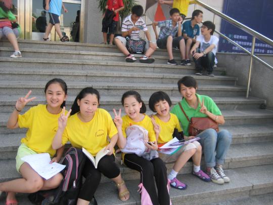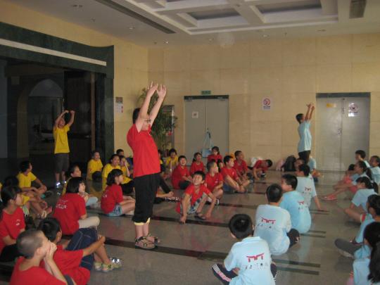 今天,志愿者们仍然是早早地赶到博物院去。在等待开门的时间里,志愿者们组织各自的队伍围坐在一起玩游戏,通过游戏更加增进彼此之间的了解,拉近小朋友们和志愿者们之间的距离。