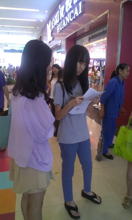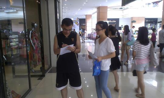月18日下午,由4名成员组成的emc易倍体育app2012级英语三班暑期实践小组于福州宝龙城市广场开展暑期社会实践“