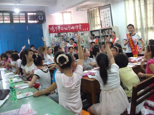 人到达农家书屋。接着,志愿者蓝毅娇和李淑娟开始五年级知识的复习课。课堂上,志愿者通过提问,教口诀,出练习题等多种方式,带领同学们轻松而高效地复习了五年级课本知识,特别在巩固旧单词时,志愿者还通过让学生上台表演表情的方式加深了同学们对关于情绪单词的印象。很快,一堂别开生面的复习课就告一段落了。短暂的休息后,第二主题班会课开始了。志愿者王江源和张蓉蓉通过美国莱特兄弟发明飞机的故事和周恩来总理“为中华之崛起而读书”的故事引入班会课的主题——“我有一个梦想”。班会上,同学们对自己的梦想畅所欲言。同时,志愿者通过有奖问答等方式让同学们很快掌握了表达自己未来梦想的重点单词和句型,最后,志愿者们还用一面心愿墙记录下每个孩子的梦想。随着一声嘹亮的“下课,起立,老师再见”,第一天长达两个小时的支教活动就在孩子们心满意足但却意犹未尽的面孔中落下帷幕了。