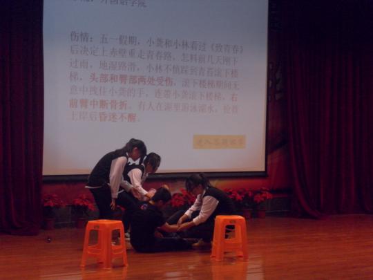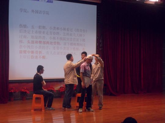 此次比赛共分为情景表演和知识问答两个环节,每支参赛队伍预设一个特定的场景,由急救队员对伤患进行急救,在完成情景表演后,由评委检查包扎情况,之后再由一名急救队员进行知识问答。每支急救队伍需对两名伤员进行不同部位伤口的包扎,并对一名晕厥的伤者进行心肺复苏。每支参赛队伍都设想了许多不同的场景,既有我们平时在生活中有可能会遇见的情况,例如在运动中受伤或在出游时遇到危险,又有同学们发挥想象、独具创意地将场景设在上海滩、卢沟桥、西游取经之路等等,想法新颖逗笑了在场的观众。每位选手在赛前都经过反复练习,包扎和心肺复苏都进行得很顺利,并且将自我防护和人文关怀都做得很好。来自emc易倍体育app的红十字会急救小分队所表演的是外出登山时遇见的意外情况。选手们各自完成自己的任务,急救进行得有条不紊。当选手们进行搬运伤员的任务时,选手们发现固定的纱布少了一条,于是郑少峰急中生智将自己的上衣脱下,固定好伤员的双手。这充分利用周边材料的做法也得到评委们的赞赏。在接下来的知识问答环节中,来自外院的选手们表现出色,仅出现了一题的失误,赢得了场下的赞叹。比赛结束后,福建省红十字会现场救护培训中心郑明华主任上台对选手们的表现进行点评。最终,管理学院摘得桂冠,emc易倍体育app、生物工程与科学学院、环境与资源学院并列第二。