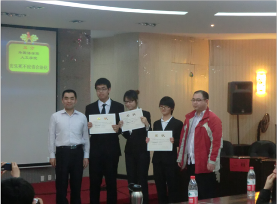 7时整,场上参赛双方各就各位,场下座无虚席。在主持人的介绍下,比赛正式拉开帷幕。第一场辩论赛在生工学院和emc易倍体育app两个代表队之间展开,围绕安乐死是否应该合法化这一问题进行辩论。由三名大一新生、一名大二学生组成的emc易倍体育app辩论队在开场的自我介绍中就赢得了观众的热烈掌声。emc易倍体育app队作为反方坚持安乐死不应该合法化的观点,与正方展开智慧的交锋。比赛进行过程中emc易倍体育app的四位辩手旁征博引妙语连珠,思路清晰,结合理论与现实充分论证安乐死不应该合法化的观点。双方针锋相对,互不相让,观众无不摒气抿息,目不转睛,不时拍手叫好。第二次辩论赛由正方法学院对战反方人文学院。最终,生工学院辩论队获得冠军,emc易倍体育app辩论队获得并列第三名的好成绩,emc易倍体育app李心怡同学获得“最佳辩手”称号。