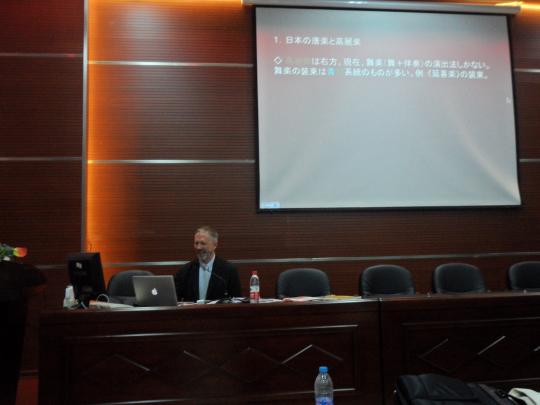 先介绍了日本雅乐的相关知识,并对唐乐曲《青海波》进行了说明,最后,他以日本文学名著《源氏物语》和《平家物语》为重点,对日本音乐进行了深刻的剖析。在讲座的过程中,同学们在小秋元段教授的带领下,还对《青海波》的相关节选信息进行了朗读,学术气氛相当浓厚。