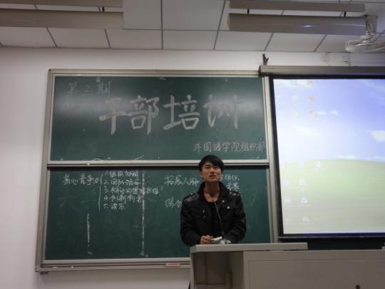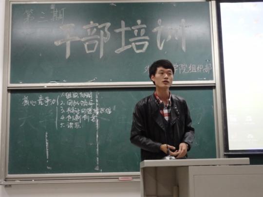 首先,辅导员刘文婷做了一个主题为“如何做好学生干部”的讲座,从当干部的动机、益处、收获以及困惑等方面为干部们分析讲解如何当好干部、如何切实为学生们服务以及如何实现学生干部与学院的共赢等问题。讲解过程中,干部们认真聆听,积极地记笔记,并一边思考辅导员的话。接着,主席团的成员分别通过交流分享了他们的学生工作历程,并针对部分问题为学生干部们详细分析。最后,由台下的干部向主席团成员提问,实现双方的交流。整场培训会既有经验的交流,过程又不乏幽默,台下时有笑声,使得培训会气氛显得融洽和谐。9时许,活动圆满结束,参与本次培训的干部们表示收获颇丰。