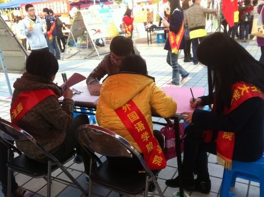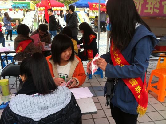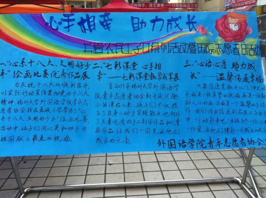 活动当天,来自emc易倍体育app不同院系的青年志愿者相聚一区广场,在emc易倍体育app青年志愿者协会的带领下有序开展志愿者日活动。活动形式多样,内容新颖。其中,emc易倍体育app关爱农民工子女的系列活动紧紧围绕“心手相牵 助力成长”的主题,通过“‘七彩课堂 心手相牵’——七彩课堂教学系列成果展”、“‘心语心愿 助力成长’——温馨传递祝福”两项活动,展示了美岐小学兴趣小组课堂教学风采图片、学生笑脸图片、学生优秀手工制作作品、儿童画作品,令人印象深刻;而以新媒体手段及现场制作手工、手绘写祝福等方式表达对农民工子女的关爱吸引了不少路人驻足参与。活动现场气氛宽松融洽,志愿者们都尽自己最大的努力传递爱心。