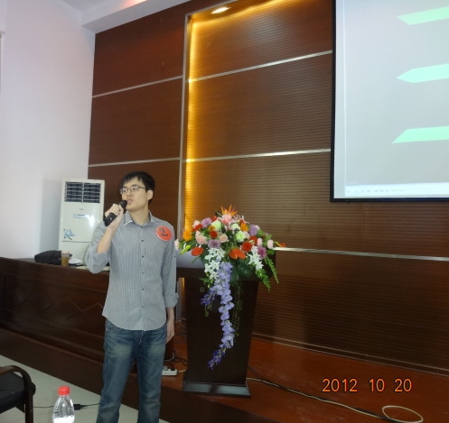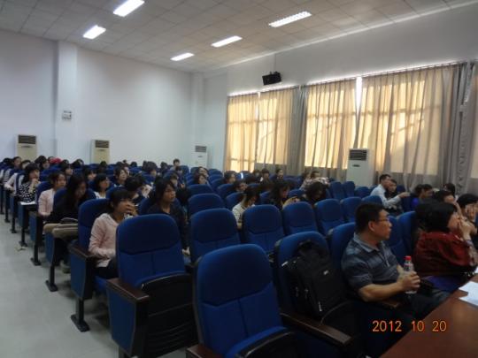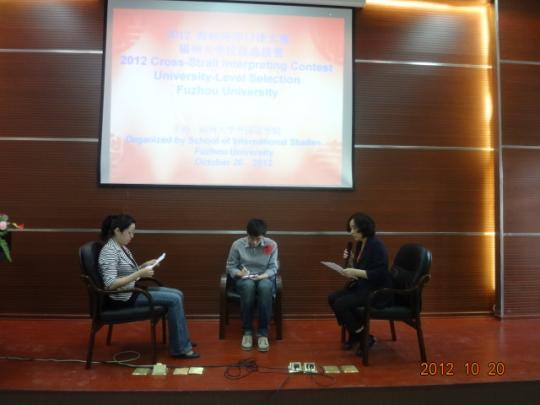 时整,院长陈小慰致欢迎词,比赛正式拉开帷幕。本次比赛围绕钓鱼岛事件以及由此引发的中国民众反日爱国举动这一时政热点展开。比赛一共分为三轮。第一轮为主旨口译,选手们需将两段分别用中、英文讲述的视频口译为相应目标语言。仅仅经过这一轮角逐便有一半选手惨遭淘汰,这使得比赛竞争更为激烈,现场气氛也遽然紧张起来。而随即展开的第二轮“对话口译”也颇有难度,此环节由两位嘉宾分别用中、英文进行对话,模拟民众针对钓鱼岛事件发表看法,由选手作为媒介为其传达大意。这一轮比赛对选手的临场反应与语言组织能力要求较高,选手表现也越发精彩。最终有