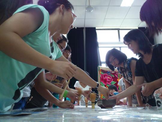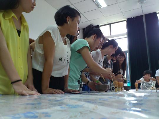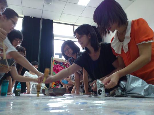 在了解茶文化背景后,活动进入实践制作环节,同学们在潘秀蓉老师的带领下开始动手泡茶。潘秀蓉老师首先拿出了日本抹茶,茶具等,亲手向大家示范了沏茶的流程,讲述在过程中需要注意的礼仪等等。接着,由同学们自己实践,泡制抹茶,感受日本茶道的魅力所在。现场气氛高涨,同学们都勇敢尝试,在沏茶过程中领略日本文化风情,感受颇深。