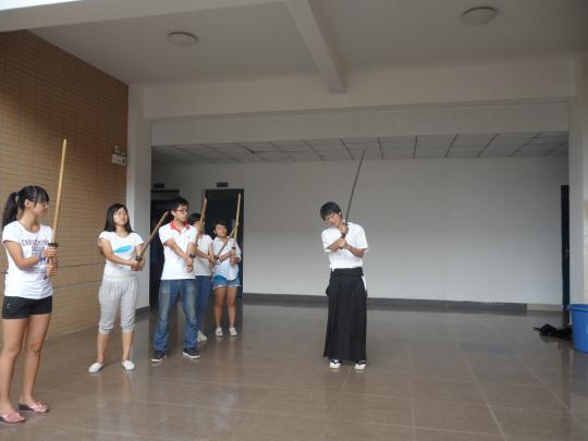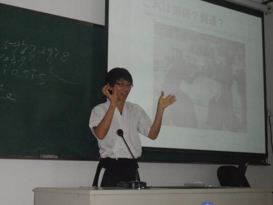 在9月11日上午和9月13日下午这两个时间段中,日语系外教臼井直也受邀为日语系11级全体学生开设了关于日本传统文化剑道的讲座。首先,在讲座中,臼井老师在PPT中详细解释了日本剑道的起源、发展和传承,并介绍了当今日本社会剑道的现状,参加此次讲座的学生在臼井老师巨细无遗的解说中了解到了剑道的独特魅力。接着,在讲座结束后,为了让学生进一步了解到剑道,臼井老师将全体同学分为两组,同学们分别在臼井老师的带领下,亲自进行了剑道的展示,并分发了竹刀,让同学们切身体会到了日本最深厚的传统文化之一—剑道。
