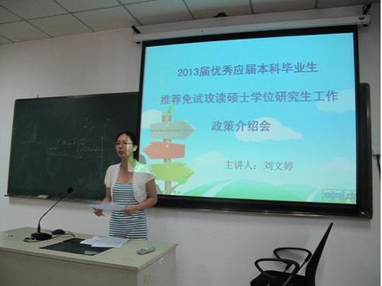 首先,刘导传达了《关于做好2013年推荐优秀应届本科毕业生免试攻读硕士学位研究生工作的通知》的精神并介绍了我院今年推免研究生的申报条件、名额分配、推荐程序、保研复试时间安排等注意事项,希望同学们根据自身情况,认真考虑,慎重选择,瞄准定位,正确把握当下的机会。除此之外,刘导还介绍了今年的外推新政策:北京师范大学,华北师范大学,华东师范大学等六所知名高校出台新政策,只要专业成绩满足条件,上述六所高校将接受外校推免生。刘导鼓励成绩在年级前50%的同学积极申请外推名额、认真准备选拔考试,并表示学院将会尽最大努力给同学们提供力所能及的帮助。最后,刘导还耐心细致解答了同学们的疑问。
