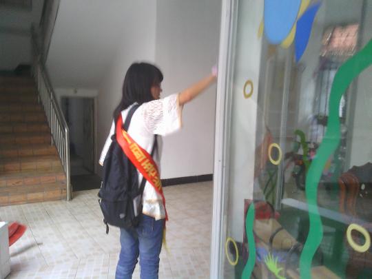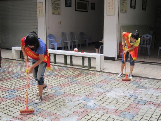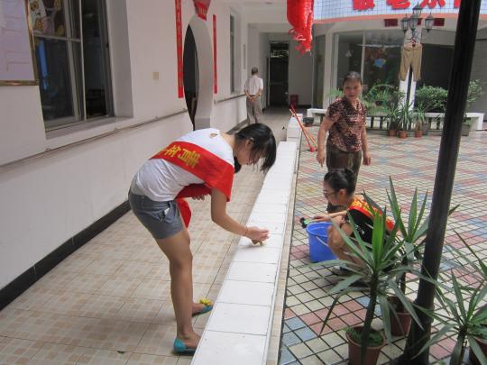 经过前几轮的敬老院之行,志愿者们已经和老人们打成一片,在开展志愿服务活动时也逐渐得心应手起来。一进敬老院的大门,志愿者们便默契地开始着手自己今天的活动项目。负责打扫卫生的志愿者手脚麻利地提着水桶、抄着扫把,不知疲倦地清洗着院子。伴着刷刷的冲洗声,不一会儿院子里就飘起了消毒水的味道,白花花的泡沫拥抱着暗青色的地砖,映衬出同学们势要把院子焕然一新的决心。这边负责清洗的志愿者,拎着抹布,一遍一遍地擦洗着座椅、窗户,一点一点对抗边角的尘埃。