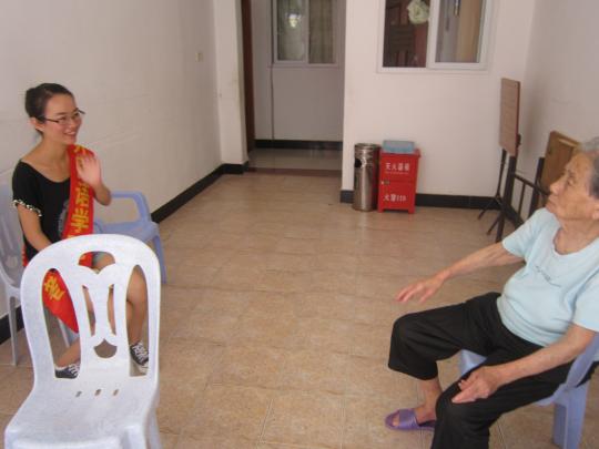 做完卫生,志愿者们就开始为老人们找乐子。会讲普通话的老人,志愿者们便围上去和老人们聊聊天,话话家常,读读报纸。遇到听不懂普通话的老人,志愿者们就把他们带到棋牌室、健身房,或在棋盘上杀上几句,或是切磋下牌技,更或者是陪着老人做几下运动。约摸正午老人们准备吃饭休息时,志愿者们才停下活动,结束今天的志愿服务活动。