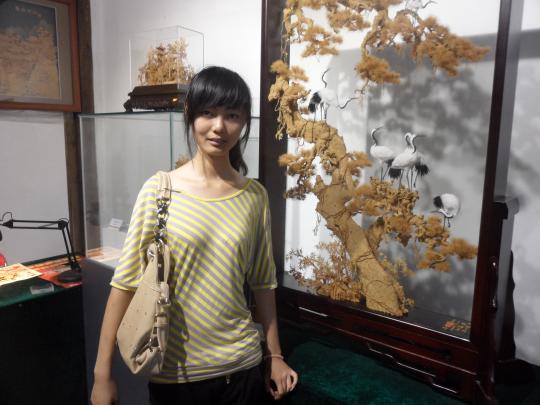 结合的手工艺品。一踏入商铺中,小分队成员就被软木画独特的艺术风格和浓厚的民族特色所吸引,她们近距离观察了这种产于欧洲地中海沿岸西班牙、葡萄牙等国的栓皮栎树的木栓层,不禁感叹福州民间的能工巧匠们精湛的雕刻技艺。制作者利用软木质地轻软、纹理细密、色调柔和及易于用刀的特性,运用中国传统的民间雕刻技艺,以刀代笔,将软木精心雕镂成中国画式的形态各异的亭台楼阁、花草树木、虫鱼鸟兽等零部件,再根据创作题材的具体需要,将这些零部件有机地组合成一幅完整的景观,从而使得中国民间精湛的雕刻技艺与中国绘画那优美而深远的意境巧妙而完美地结合起来。在参观博物馆的软木画专区时,小分队成员更是对软木画作品啧啧称奇。她们表示,软木画看起来似乎只是轻松的案头工艺,可做起来真不容易,一幢楼阁中的窗棂、椽子、柱子等都细若发丝,密密的屋瓦也不足一厘米,而松树的松丝更是细超发丝,能工巧匠们如果没有足够的细心和耐心是完不成如此繁杂的作品的。