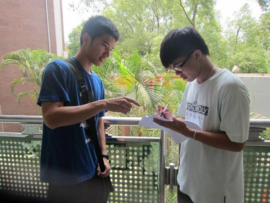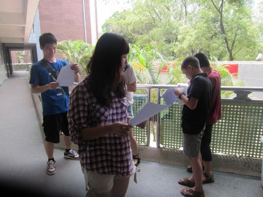 16日当天,小队成员在泉州外国语中学进行问卷调查,当天虽然烈日当空,但丝毫不减他们做问卷的热情和态度。实践队对泉州外国语中学的不同年级的同学和任课老师进行了调查,总共约发放了