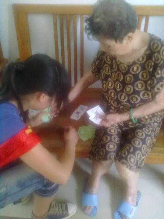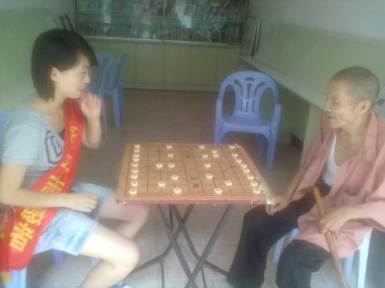 在那里,有的志愿者手把手地教他们玩简单的纸牌游戏,有的和老爷爷在棋盘上斗智斗勇,有的和老人家手拉着手亲切地聊天。刚开始,老人们显得有些生疏。通过志愿者们耐心的说明与悉心的教导之后,老人们很快和志愿者们打成一片,老老少少的脸上都露出开心满足的笑容。