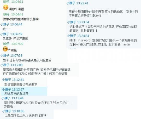 首先他们搜集了网络上对于微博的各种信息并作了整理,接下来成员们撰写了采访提纲并且联系了不同年龄段的微博网友进行了采访。对于调查小组的提问,多数网友都积极配合,大胆发表自己的观点。其中一位网名为“小雅子”的网友认为微博让她有机会接触到更多人的生活,并且每条微博140字数的限制也考验了用户汉字的凝练度和对文字的把握。更为积极的一方面是图文相配的方式也极大地促进了用户PS水平的进一步提高。网友“明媚的阳光”见解独到:“微博的推广使不少商家由大规模投放平面广告或者依靠网站流量进行广告宣传的方式转向由热门博主转发广告微博,这是一种全新的尝试,有可能会成为将来营销的新手段。”而一位名为“缺钙”的网友则有着另外的看法。他认为微博虽然好处多多,但也确实助长了谣言的传播,更为严重的是,随着小朋友接触网络的年龄愈发的低龄化,微博的种种不良言论无疑需要人们警惕。采访中调查小组成员还发现其实微博的使用还是十分方便并且健康的,他们多是利用微博看看新闻或是出于好奇心观察别人的生活方式,以转发微博者居多,真正撰写原创微博来记录生活点滴的用户在这些受访者中并不多。