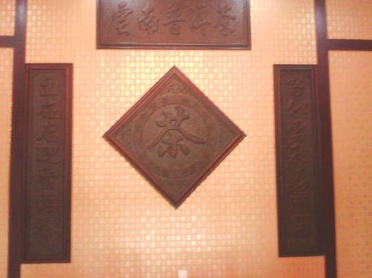 魏荫的工作人员热情接待了我们,替我们一帮人泡了魏荫名茶。从清香型到浓香型,我们边听着工作人员的介绍边细细品茗,真切地了解和体验到安溪铁观音的韵味和魅力。接着,魏荫的一位工作人员充当起导游,带领我们一行人参观起了魏荫的茶文化大观园。我们见到了不同种类的茶叶,有大红袍,有云南沱茶,还有各类铁观音。最让人惊奇的是,魏荫茶厂中的许多古韵装饰——中间的茶字及两边的对联(如图),材质都是正宗的普洱茶!据工作人员介绍,用到的茶叶大概达二十几斤,按照每斤的价格,如此一景价值可达好几百万。紧接着,我们又参观了魏荫的茶史馆,了解到了魏荫名茶的历史。在茶史馆中,我们看到了很多古时茶农制茶的工具,也充分了解到了制茶的过程。