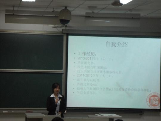 5月28日晚上6时30分,在全院师生的关注下,由emc易倍体育app学生会两委办主办的“2012——2013学年团委学生会主席团学生会换届选举大会”在文1—404隆重举行。此次换届选举有10级陈冬冬,郭馨,黄玉洁,王丹凤,肖凌,张馥霖,张心宇七位选手参赛。担任此次换届选举大会的评委有emc易倍体育app团委书记周越、辅导员黄柑莲和刘文婷,学院各主席团成员亦应邀出席此次大会。