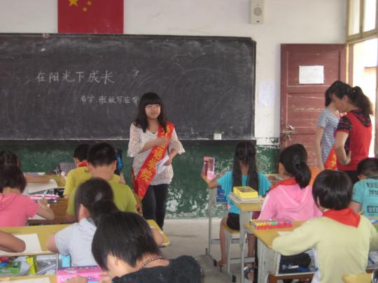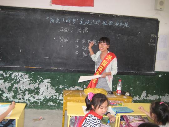 支教活动在孩子们上课后正式开始。首先,每个志愿者开始分发学院准备的画纸,在大家都准备好绘画工具后,孩子们开始着画),教室里原来的嬉笑声一片,渐渐地在志愿者的指挥下他们安静了下来,专注的投入自己的画中。志愿者们细心的为孩子找好了所要画的素材,那学生们自己涂上自己喜爱的颜色,一幅美丽的画逐渐在孩子手中诞生。还有的孩子自己动手,有的学生没有用素材,他们尽情的发挥着自己的想象力,拿起彩笔,把一幅幅脑海中的画认认真真的画在纸上,每一幅画都可以看到他们的纯真与可爱。在此期间,孩子们频频举手,请教志愿者:“老师,这个怎么画?”、“老师,这个要涂什么颜色?”不管孩子有多少问题,志愿者们都会不厌其烦的为其解答,直到他们完成自己的绘画。