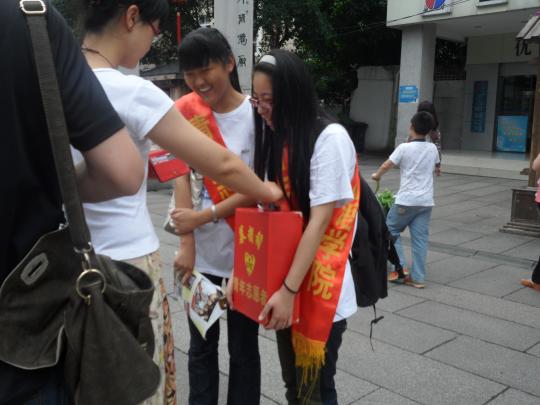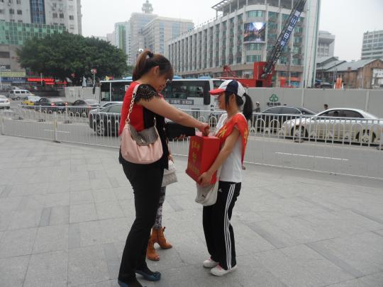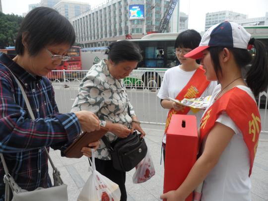 点,第一批志愿者们就已来到西湖公园与东街口,第二批志愿者则在中午与他们换班,完成交接。志愿者们两人一组,每组持有一个募捐箱,分散在不同地点向路人介绍活动并倡议募捐。面对来来往往的人群,有些志愿者在一开始有些放不开,不过很快他们就鼓起勇气,用真诚的语言向路人介绍募捐活动。在过程中不少志愿者受到冷脸相待,也曾遭遇身份质疑,但更多的,是被一些平凡的举动深深打动。在志愿者的讲述中,记者了解到,在诸多捐款的好心人中,有年幼的小朋友,有身上插着管子的癌症患者,还有友善的外国友人。当一位拾荒老人看到募捐箱并投进