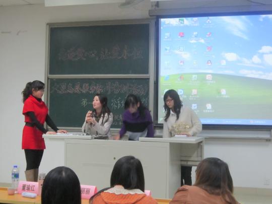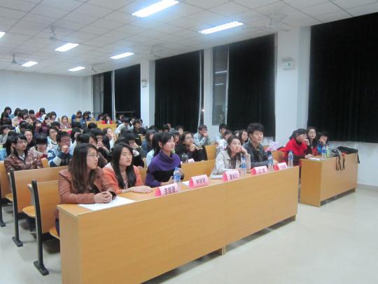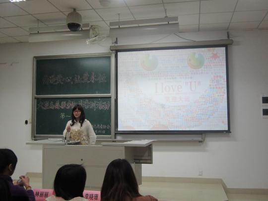 19时许,大会正式开始。在主持人致开场词后,三位优秀青年志愿者分别上台与台下的同学们分享她们丰富的志愿者经历及感触。首先,志愿服务经历最为丰富的董瑜红同学上台进行经验交流,她结合其在广州亚运会、全国特奥会的经验,表示志愿者并非如同学们想像中那般光鲜耀人,更多时候志愿者需要面临高强度的工作挑战,有的时候还要解决观众对其泄愤等问题。她希望志愿者们能调整心理落差,不应抱着看明星的心态参加志愿服务,更重要的是为了更好的服务他人。随后,由现已是研二的林丽丽同学向同学们讲述她在6·18海峡项目成果交易会等大型会展的翻译志愿服务经历。她强调要做好一名口译志愿者,需对即将参与的活动进行较为深入的了解。在接待外宾方面,她提出志愿者需注重文化、习俗上的差异,并做好讲解工作的前期准备。最后与大家分享经验的是研一的江筠同学。她将发言重点放在志愿者个人素质上。她侃侃而谈,风趣幽默。她诙谐的发言引得台下同学们的阵阵笑声,同时她丰富的志愿者经历也让同学们由衷地钦佩。在互动环节中,同学们踊跃提问,三名志愿者也热情地做出回应。最后,外院的学生干部们为三名志愿者送上精心准备的小礼物。志愿者培训活动就此圆满落下帷幕。