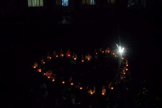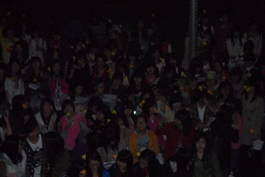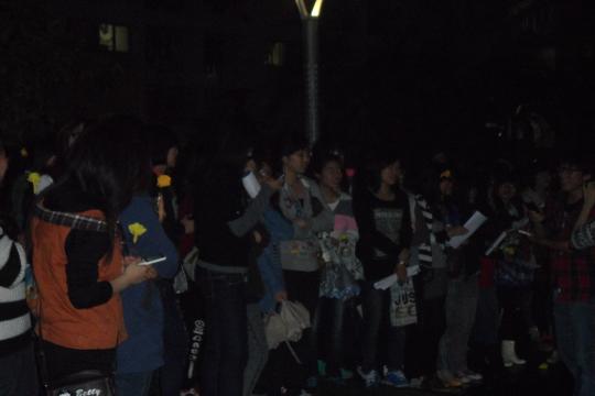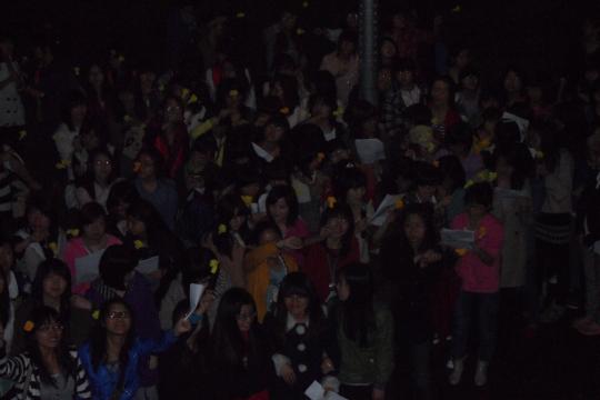 一曲《死了都要爱》首先震撼全场,引来无数男生围观。随后,主持人出场带领全体女生唱起代表外院女生对男生的祝福歌曲《暖暖》,全场女生每人带着一朵纸玫瑰,一边唱歌一边挥舞,歌声甜美,全场洋溢着温馨感动的气氛。