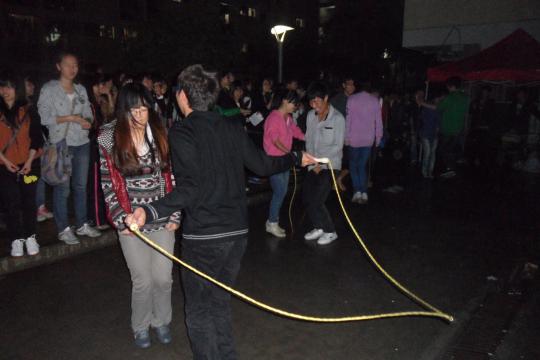 热场之后,以童话故事为主线的唱歌游戏环节火热上演。首先分别由英语、日语和德语系女生为男生们献上本系语言的歌曲,独具特色,再度引起男生的阵阵掌声与欢呼声。随后,开始五组自由双人跳绳比赛,胜者礼物奖品大派送,大家热情参与,气氛十分活跃。接下来的“歌曲大接龙”,“心口不一”等小游戏更是充满乐趣,引来在场男女生阵阵笑声,欢乐在全场蔓延。