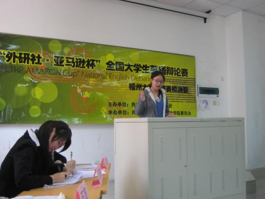主持人正式宣布比赛开始,各位参赛的选手就坐完毕后,正反双方一一陈述了自己的观点。第一场的比赛进行了四十多分钟,参赛人员走进观众席等待结果。接着,第二场比赛开始,辩题也随之变换了,第二场辩论达到了高潮,精彩再次升级,他们一口流利的英语使在座的许多同学都投去崇拜的目光。经过两轮的精彩角逐之后主持人宣布比赛成绩,来自八方物流学院的石翰和许丽丽凭其精彩的表现夺得第一名,emc易倍体育app的林语嫣和孙芷云名列第二,emc易倍体育app的吴雪晨和王语嫣及材料学院的吴天瑜和陈斌并列第三。除此之外,emc易倍体育app的孙芷云和王语嫣分别获得个人奖项中的最佳辩手奖和最佳台风奖。