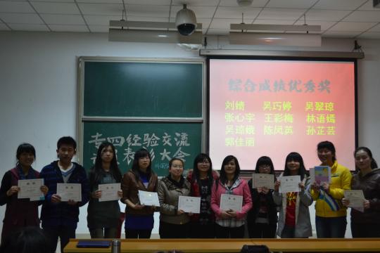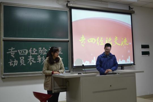 专四经验交流表彰动员大会在班长王彩梅的主持下井然有序地进行。首先,我们邀请的优秀大三学姐学长吴威三、郑丹妮与我们分享专四的备考经验。通过他们有条不紊的讲述、经验的分享,同学们深刻意识到英语的积累绝非一朝一夕就可完成,对于专四的准备要愈早愈好,同时在复习的阶段也要有铁杵磨成针的毅力和坚持。此外,学长学姐给我们介绍的学习小窍门和考场实例分析也让同学们多有俾益。在经验交流的互动过程中,同学就自己对学习、对专四备考的疑惑进行提问,这些问题都得到学长学姐细心的解答。最后,这一环节在融洽而热烈的气氛中结束。
