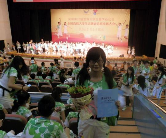 在第26届深圳世界大学生运动会上,她与福建另外8名志愿者坚守在各自的岗位上,推动着大运会的顺利进行。期间,她受到福田赛区志愿者部王强部长的亲切慰问,并参与2011中欧青年交流年等系列活动。此外,她还担任大运会福建志愿服务团队宣传部部长,负责团队大运会志愿服务工作简报的统筹和撰写。她所撰写的志愿服务心得先后刊登在《全国高校大学生志愿者工作简报》第5期及第11期上。她也因表现优异被评为“大运会志愿者每日之星”,并获组委会颁发的大运会赛会志愿者服务证书及荣誉证书。