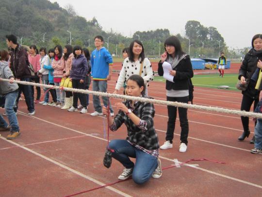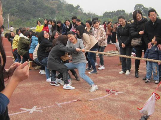 下午2时许,拔河比赛正式开始。首先进行的是年级赛,分为淘汰赛和循环赛。在淘汰赛环节,各年级按照抽签结果分成三组,采取三局两胜制进行比赛。每局比赛结束,待双方交换场地后,继续比赛。而后将有三支队伍进入循环赛环节。在循环赛中,三支队伍需两两进行较量,第一名进入总决赛。在经历一番激烈角逐后,11级英语1班、10级英语3班以及09级日语2班脱颖而出,争夺最后的冠军宝座。各班选手们士气高涨,个个摩拳擦掌,跃跃欲试。负责人严肃认真地叮嘱选手们注意各方面细节,体育部部员们紧张地进行各方面准备工作。待裁判一声令下,各队选手全力拼搏。有的喊着一致的口号加油打气,有的摔倒在地也不愿放开手中的麻绳。众人的目光都紧紧盯着左右摇晃的中心线,现场气氛十分紧张,每个人都紧绷神经。最终,09级日语2班力压群雄,再度夺得冠军宝座。10级英语3班位居第二,11级英语1班取得了第三名的好成绩。