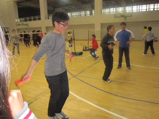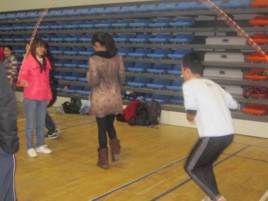 本次比赛分为个人单摇、个人双摇和3分钟10人长绳“8”字跳。最后结果以三个项目计数的总和作为本单位团体总成绩,个人赛根据团体赛中单、双摇的成绩确定个人名次。比赛前,随处可见参赛选手在加紧练习,以确保能在比赛时发挥出最佳水平。随后,比赛在体育老师井然有序地指挥下拉开序幕。参赛选手一个个全力以赴,只为了能在最短的时间内,尽己所能,拿到最好的成绩。在场的观众也被选手们的投入所打动,在一旁加油打气,比赛现场气氛十分的热烈,与室外寒冷的天气形成鲜明地对比。在个人赛中,外院同学专心把握住跳跃的节奏感,将精力集中在不断晃动的绳子和双脚。一下,两下,三下,两旁的同学紧张又兴奋地帮着比赛的同学数着数目,脸上透着激动的红光。而在随后的长绳比赛中,外院代表队在绝佳的配合和加油队的呐喊下,赛出了优秀的成绩。