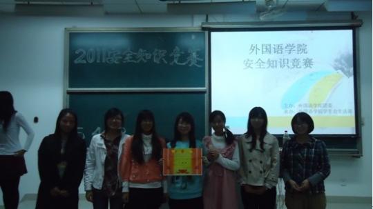 本次知识竞赛分为三个环节,共有17支队伍参赛。在简短的自我介绍后,第一轮必答题环节“步步为营”正式开始。参赛队伍通过亮出选项牌来回答选择题和判断题。经过五轮紧张的比拼较量,8支队伍进入第二轮“激情似火”——抢答题环节。在这一个考验选手反应能力的环节中,有的队伍发挥出色,凭借敏捷的反应和队友们默契的配合连连得分;也有选手似乎太紧张,因抢答错误而失去领先的优势。赛场上的风云变幻让在场的同学们时而鼓掌欢呼,时而顿足叹息,赛场气氛逐渐升温。在惊险刺激的抢答环节后,4支队伍晋级决赛。在第三轮“惊心动魄”环节中,面对“牛刀小试”、“游刃有余”、“谁与争锋”三种选择,选手们施展出浑身解数。有的队伍沉着稳重,有的队伍胆大心细。最终,霹雳队从中脱颖而出,勇夺桂冠。晴天队紧追其后,获得亚军,101队和灵灵五队也取得三等奖的好成绩。11级日语1班和11级英语1班获得最佳组织奖。