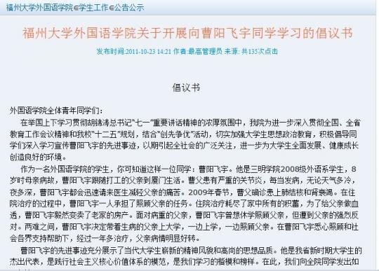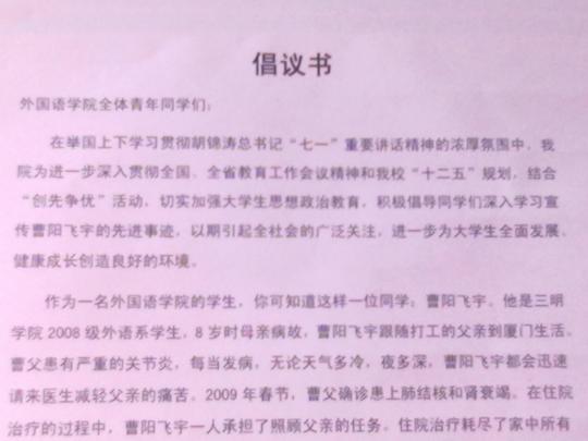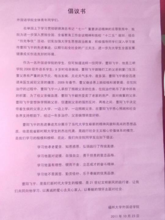 在认真学习曹阳飞宇同学先进事迹、积极组织各项宣传活动的同时,我院也全面落实精神实质,树立学习的典型,通过平时的学习生活实践传达爱心、责任心、感恩之心。