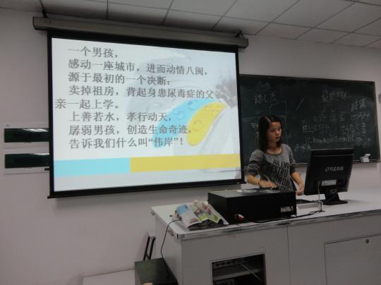09级日语一班以ppt展示和视频展播的方式,开展了以“学会感恩 唤醒责任 倡导奉献”为主题的教育活动。主持人还从曹阳飞宇这一典型事迹出发,引申至其他先进人物和先进事迹,如获得2005年感动中国十大人物的洪战辉及获得07年度“中国大学生自强之星”的秦燕等,并邀请几位学生代表上台进行了感言陈述。