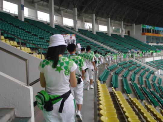 来自福建的志愿者告诉我们,早上北京奥运会志愿者培训中心主任孙葆丽给他们上了一堂有关礼仪和志愿者精神等相关方面的课程。课程中,老师以北京奥运会志愿者为例,给在场的每一个人陈说了一个个感人的事例。一位外语志愿者回忆道,在众多的事例中,让她印象很深的是很多负责引导观众的志愿者因为是正对者着观众,背对着赛场的,所以他们无法观看比赛。但是无论现场气氛多么热烈、多么精彩,没有一个志愿者转过身去看现场比赛。这堂课给所有志愿者带来很大的触动,让他们知道志愿者精神贵在坚守,贵在专注。