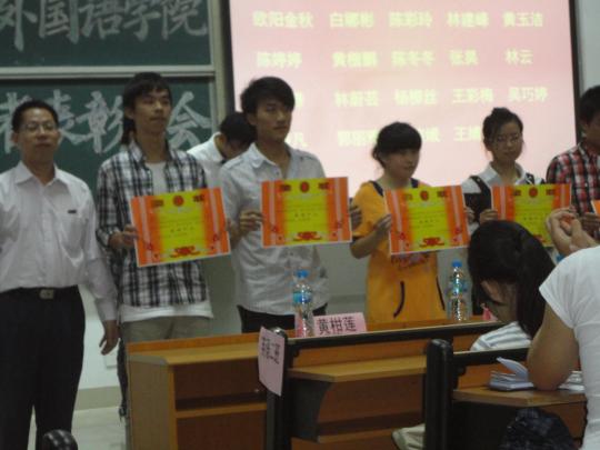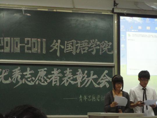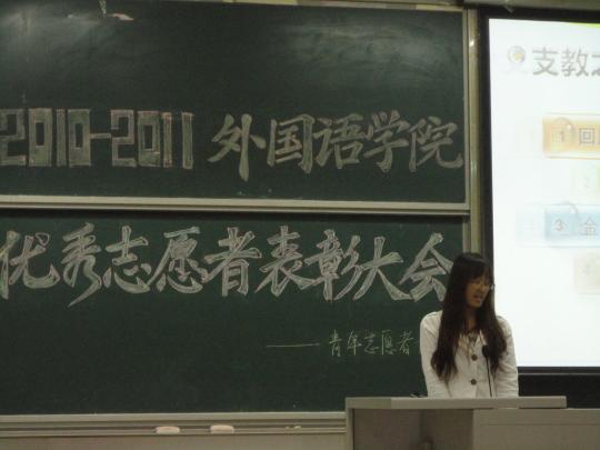 大会伊始,伴随着柔和的音乐声,青协会长助理兰利芳以PPT的形式与同学们一起,共同回顾志愿者们一路走来支教的点点滴滴,并播放视频展示志愿者们在暑期社会实践中的杰出风采。于此同时,她也呼吁更多的人行动起来,加入志愿者的队伍中去。同学们为志愿者们感动之余,也不禁暗暗鼓起一份热心奉献之心。随后,在众人的期待中,主持人依次宣布了各个奖项的获奖名单。大会共颁发了优秀志愿者,宣传报道突出奖,先进个人奖和暑期实践优秀项目负责人四个奖项。副书记刘旺、团委副书记周越分别为各获奖志愿们颁发奖状,以资鼓励。现场掌声不断,纷纷为优秀志愿者们喝彩。最后,在主持人的宣布声中,大会圆满结束,各个嘉宾及获奖者依次退场。